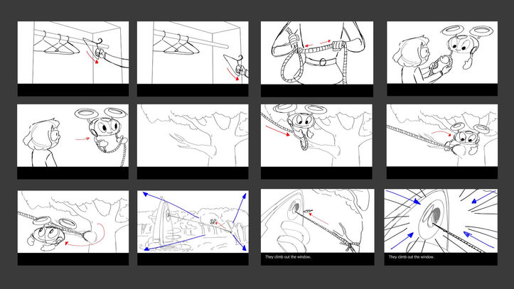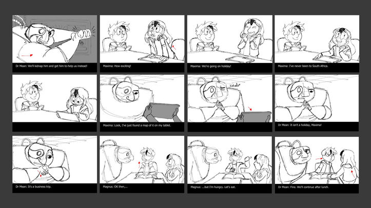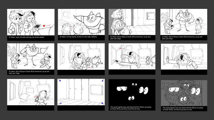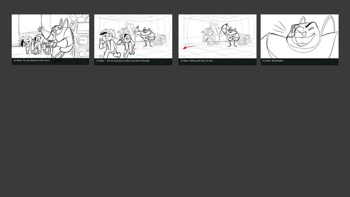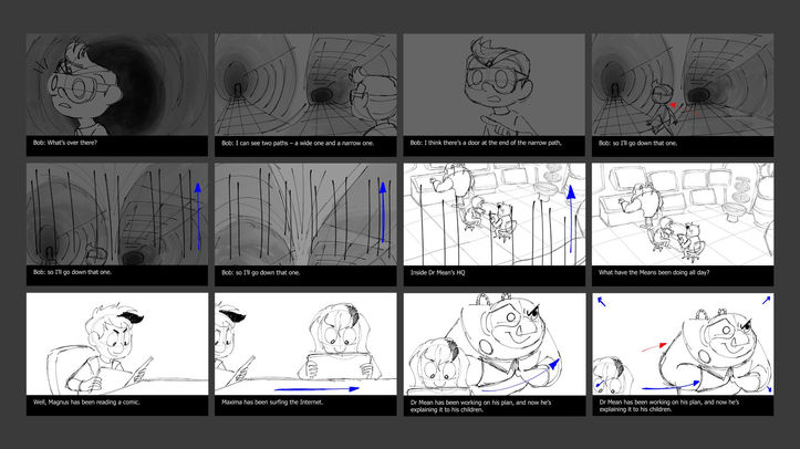 Storyboard of an episode from the English teaching book The Wonderful Wilsons for young learners. In this little story, Clues has fallen down a secret trapdoor in a tunnel, while Dr. Mean is plotting his evil scheme in his lab.
